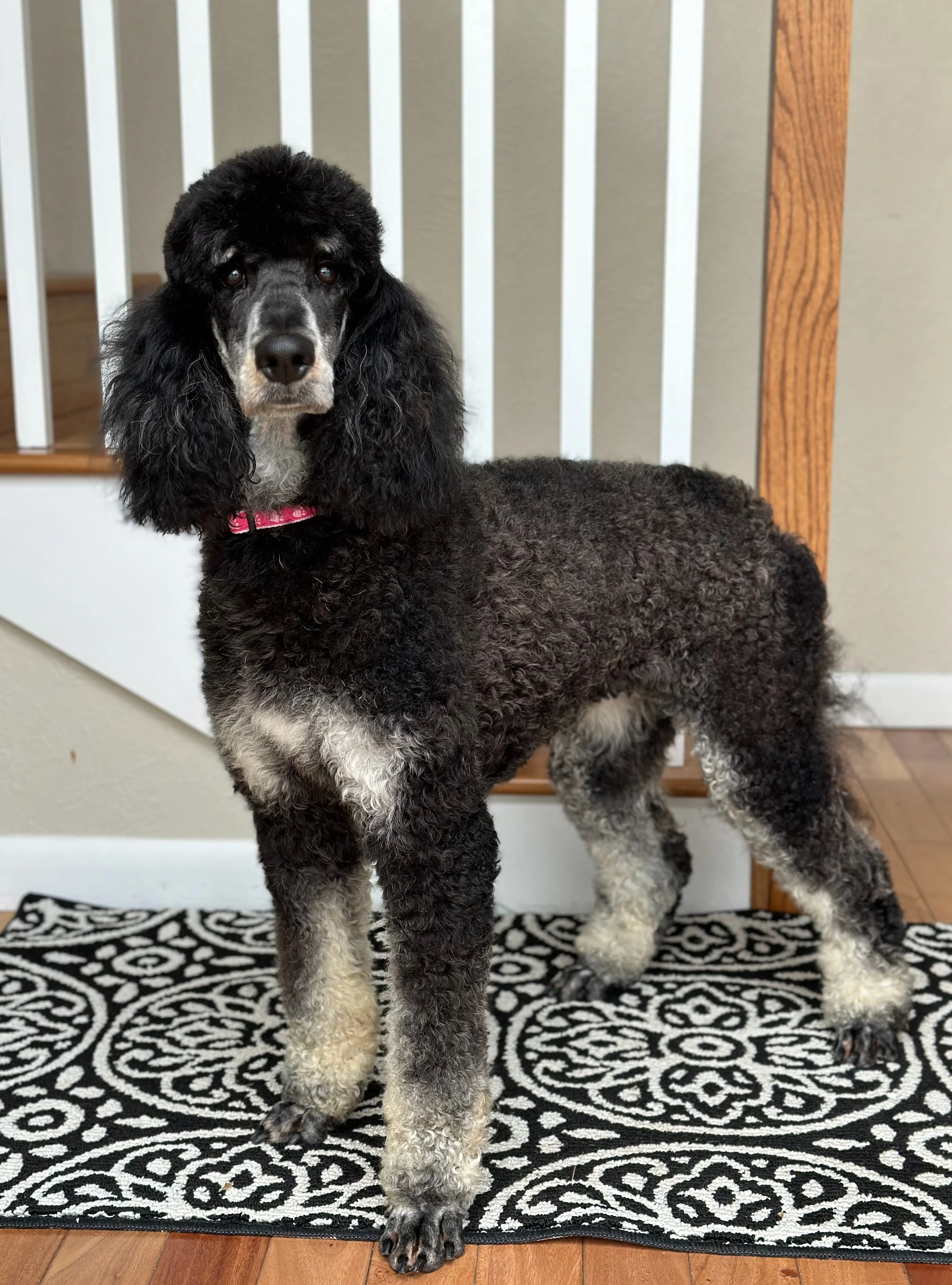 Emerald is a Phantom Standard Poodle. She is OFA Hips Good, OFA Elbows normal, OFA Eyes normal, OFA Heart Normal, OFA Patella Normal. vWD, PRA-PRCD, NEWS and DM clear. Animal Genetics DNA results!