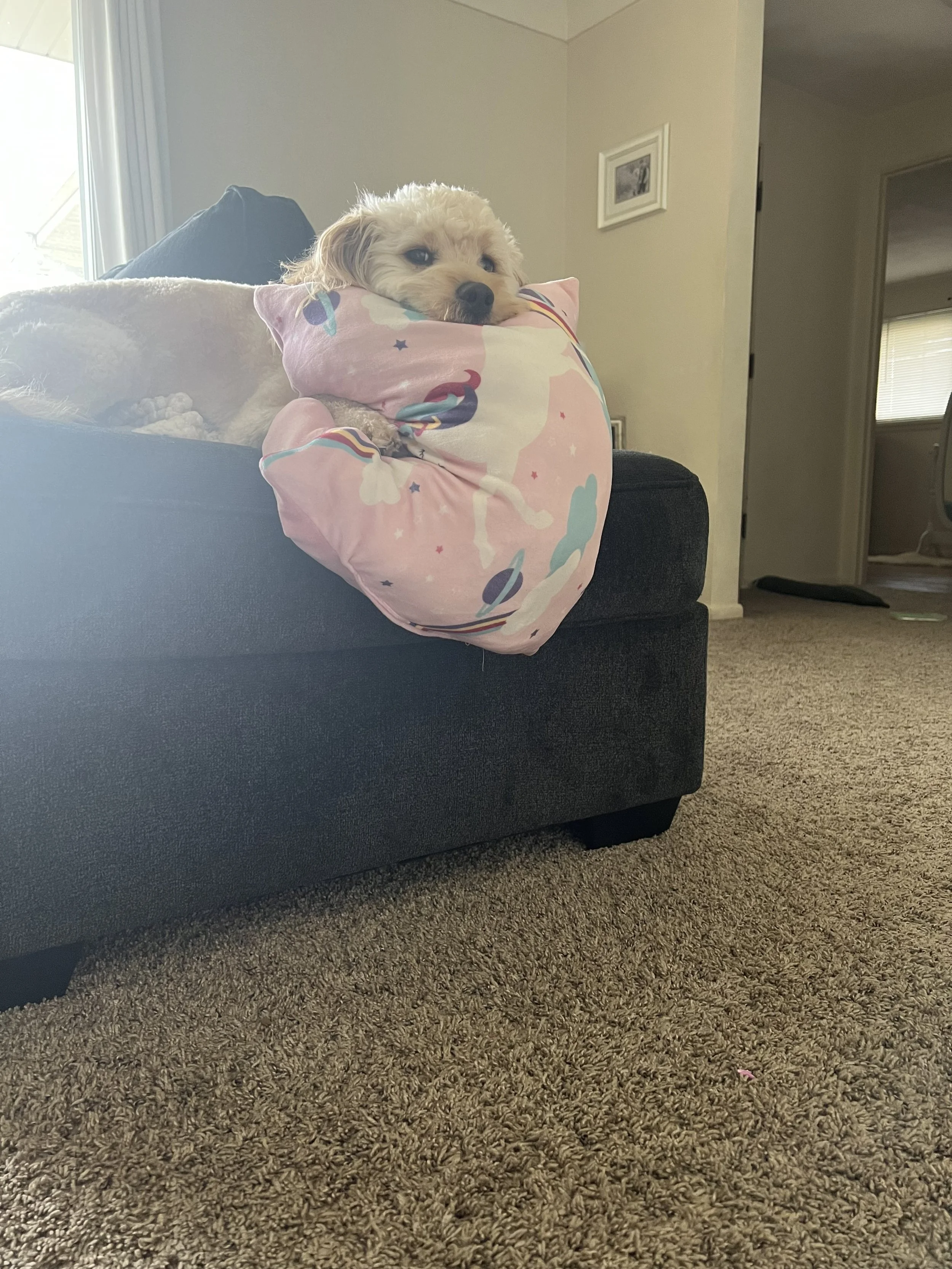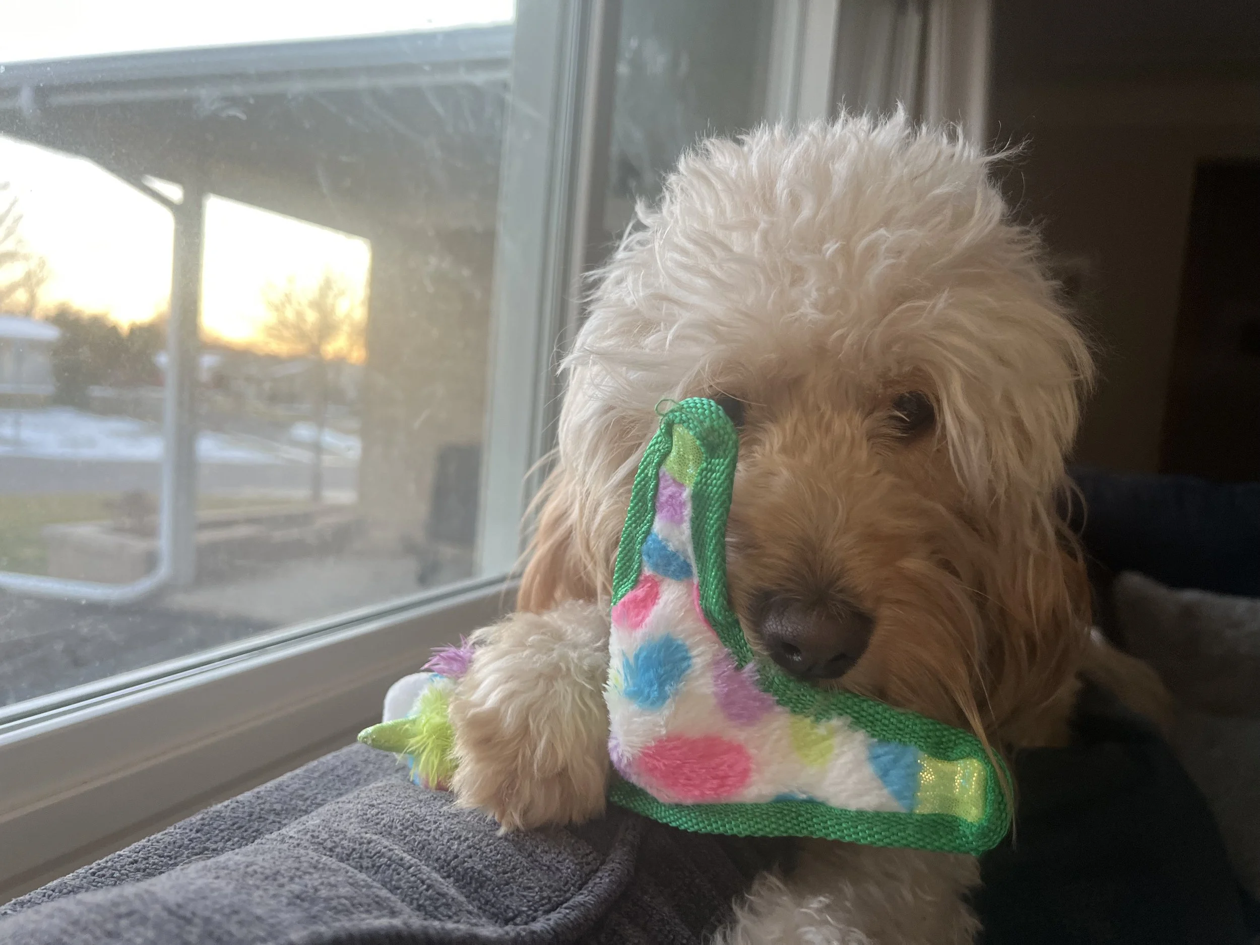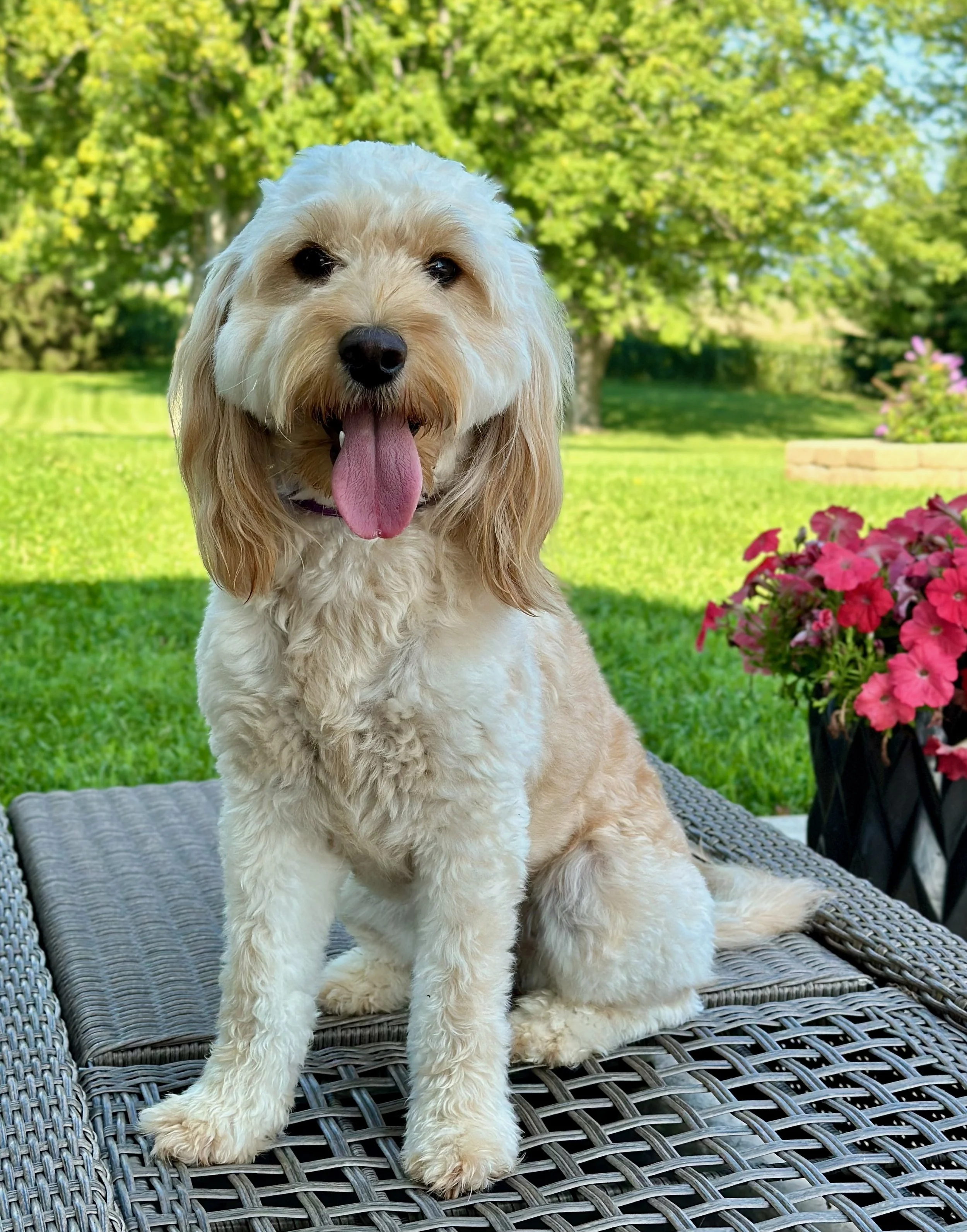 Evie is an F1 Mini English Goldendoodle. She is OFA Hips Good, OFA Elbows Normal, OFA Eyes Normal, OFA Heart Normal, OFA Patella Normal. vWD, PRA-PRCD clear through parentage. Animal Genetics DNA results!