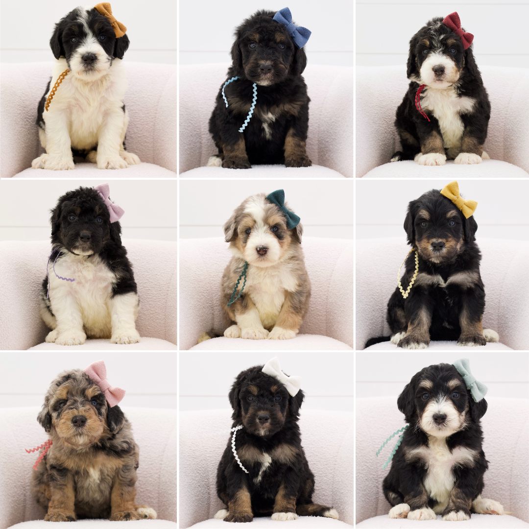 Andi + Legend had nine females! They are F1b Standard Bernedoodles. Click here to view their litter page. Their take home date is April 30th. The choosing date is April 10th. We have 2nd, 3rd, 4th, 5th, 6th, 7th, 8th, and 9th choosing spots open. Application and $200 deposit required to reserve your choosing spot. Ask about us!