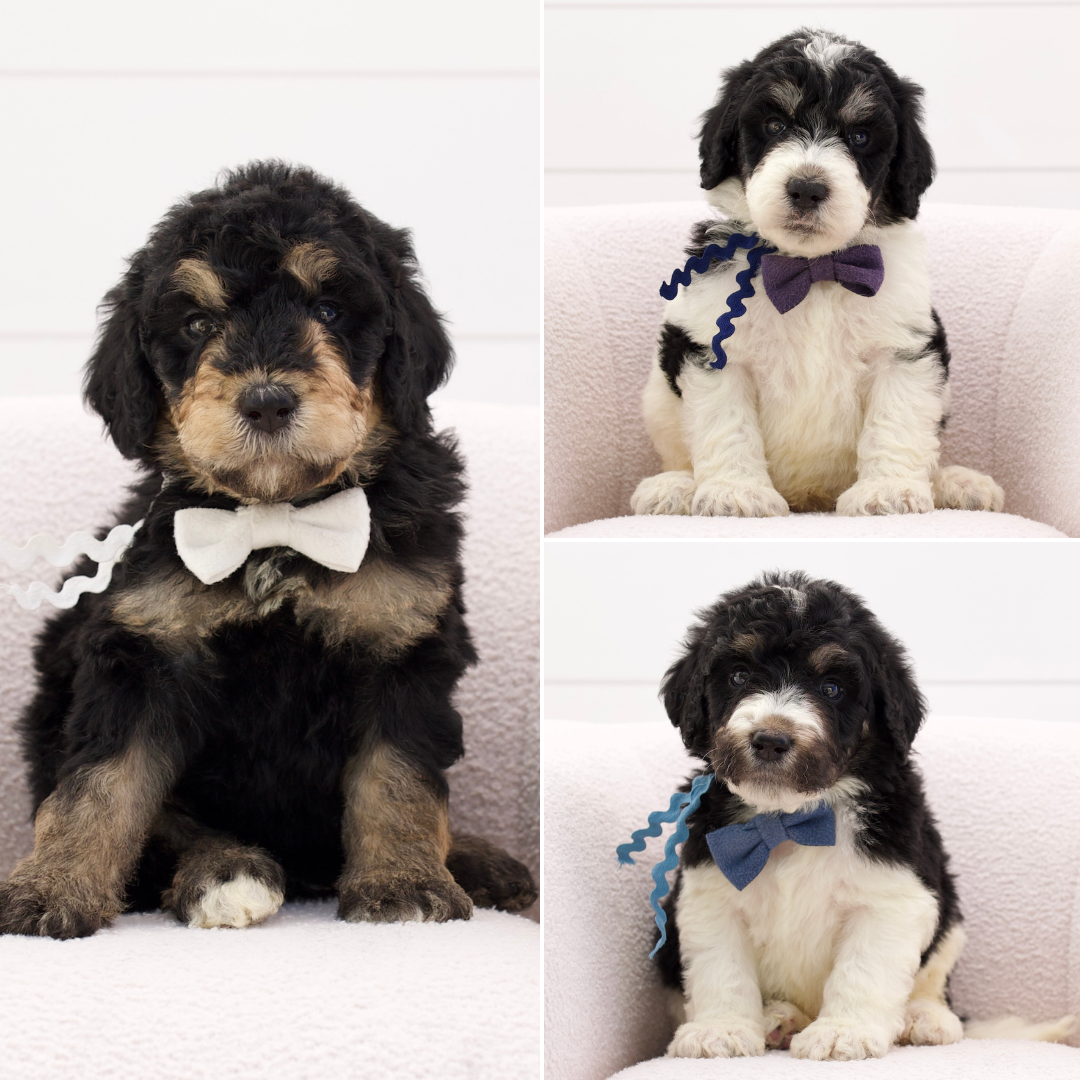 Andi + Legend had three males! They are F1b Standard Bernedoodles. Click here to view their litter page. Their take home date is April 30th. The choosing date is April 10th. We have 1st, 2nd, and 3rd choosing spots open. Application and $200 deposit required to reserve your choosing spot. Ask about us!