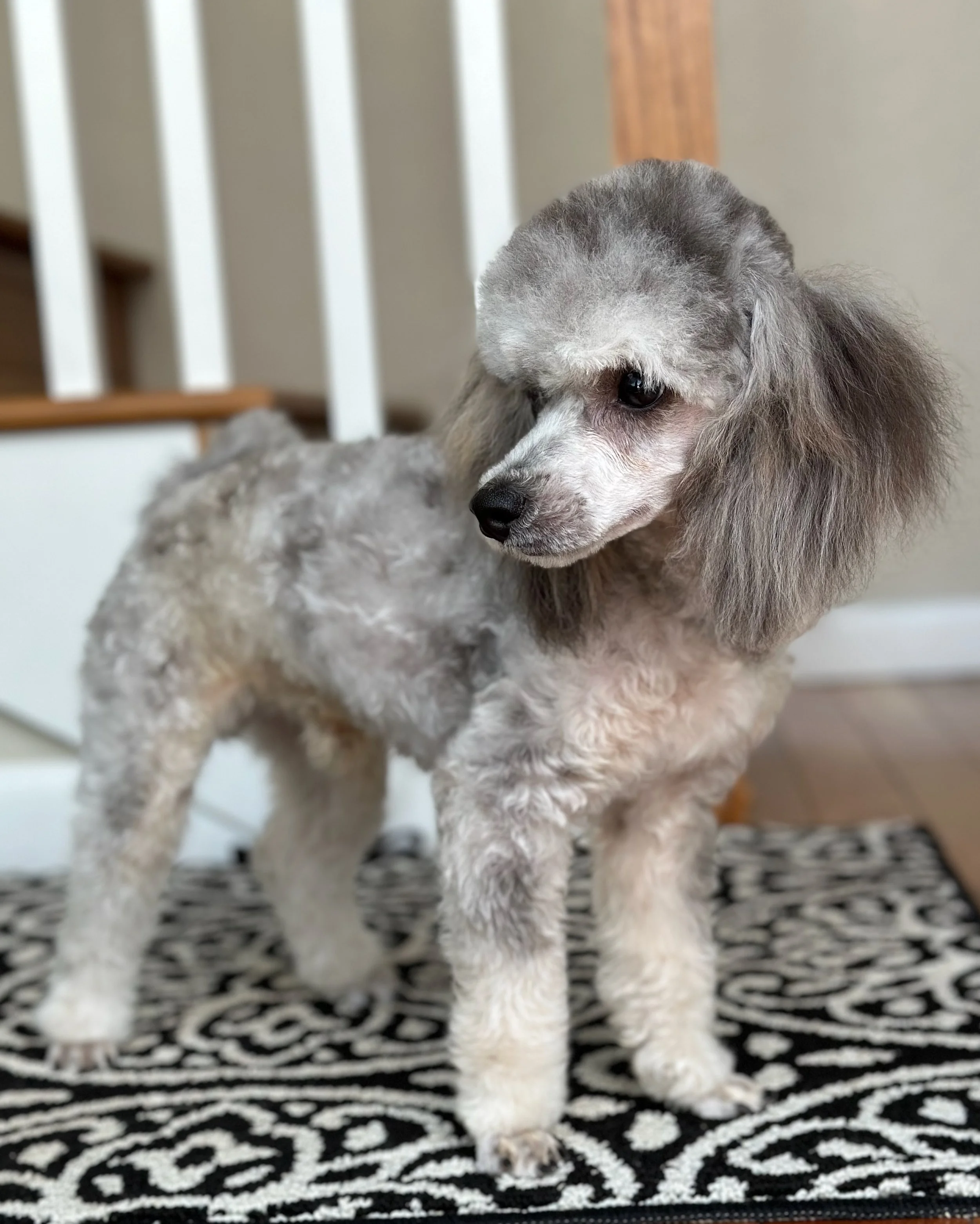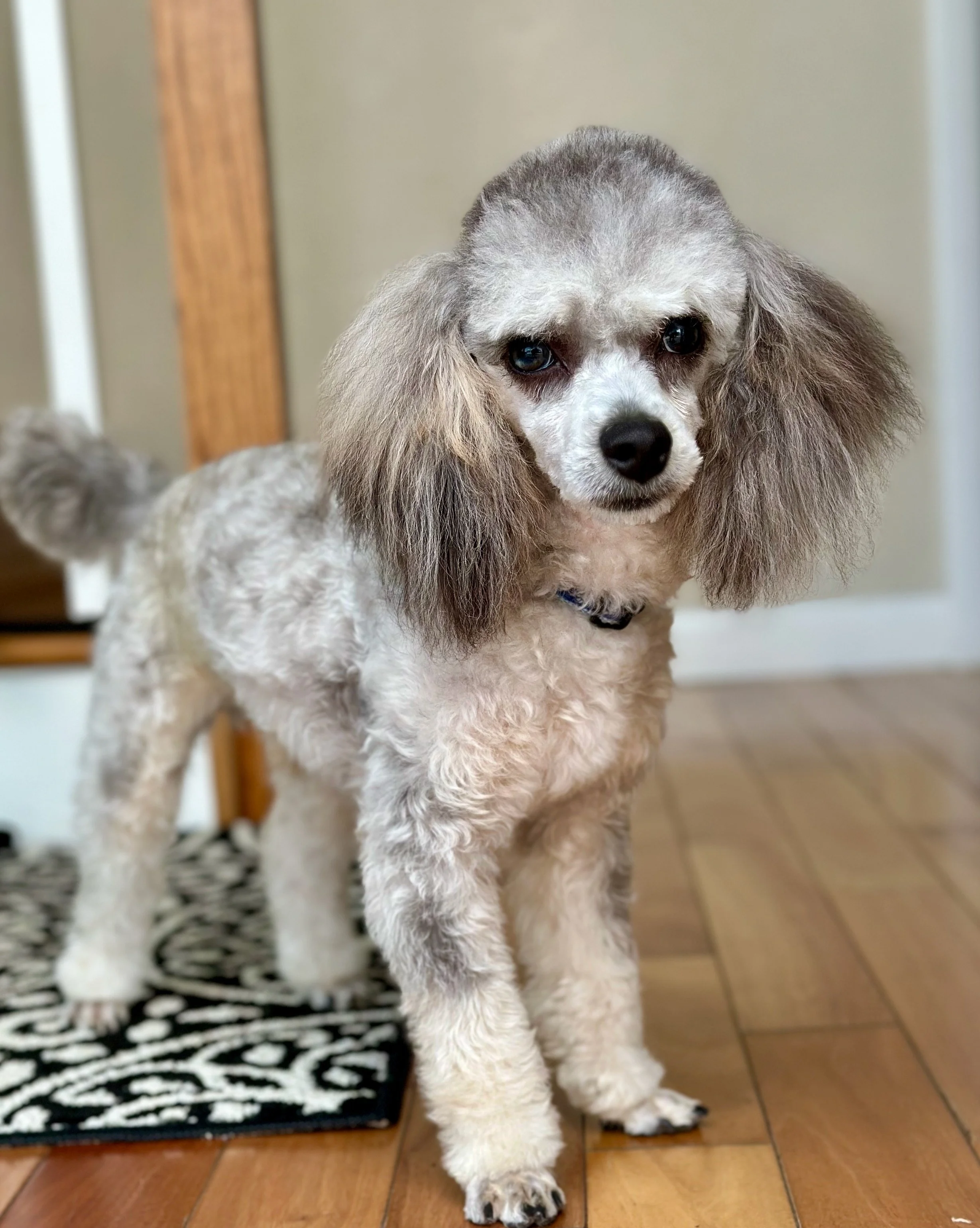 Stewart is a Blue Merle Toy Poodle. He is OFA Hips Good, OFA Elbows Normal, OFA Patellas Normal, OFA Heart Normal, OFA Eyes Normal. vWD, PRA-PRCD and DM clear through parentage.